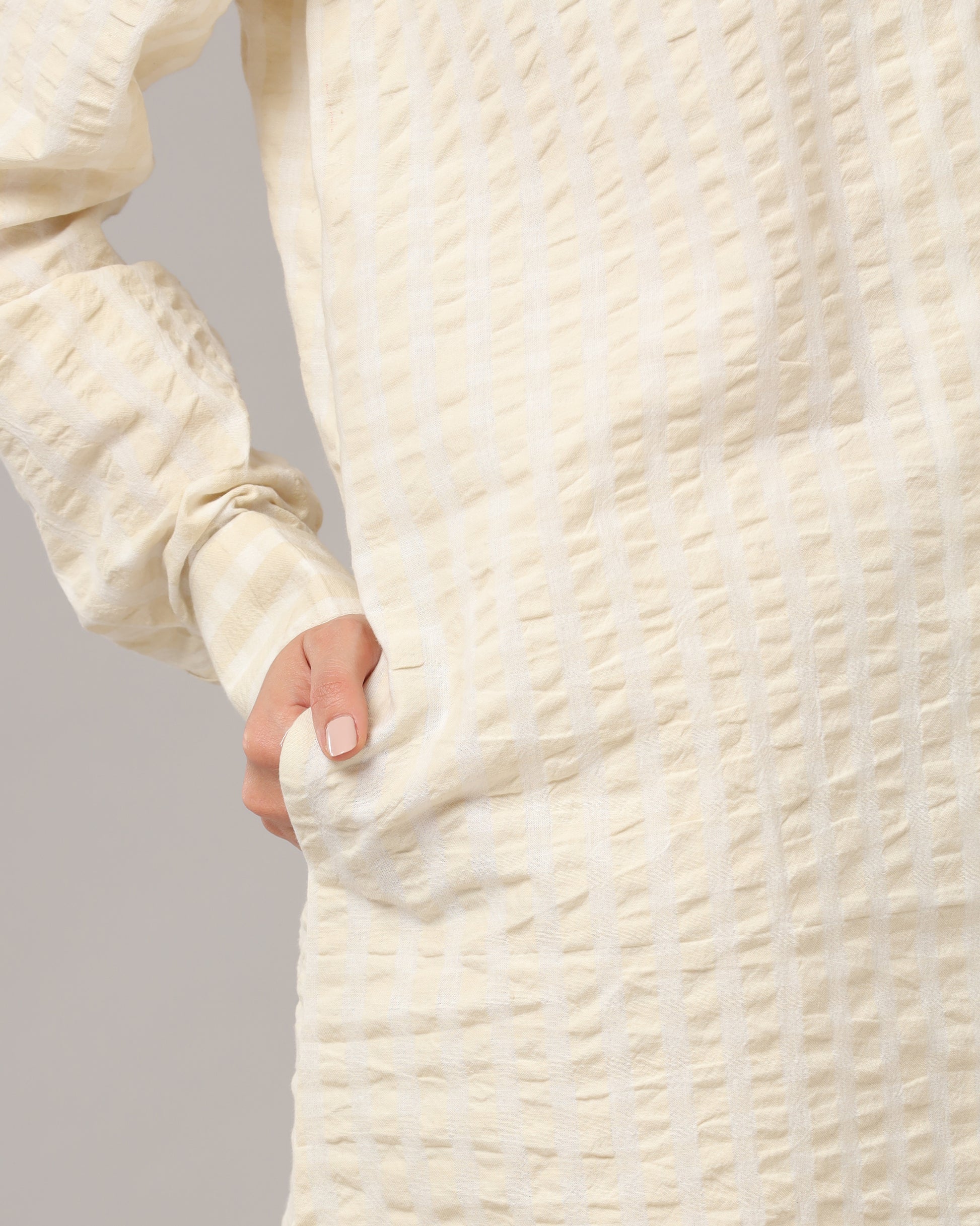 Fabric - 100% Cotton with pastel yellow and beige stripes.