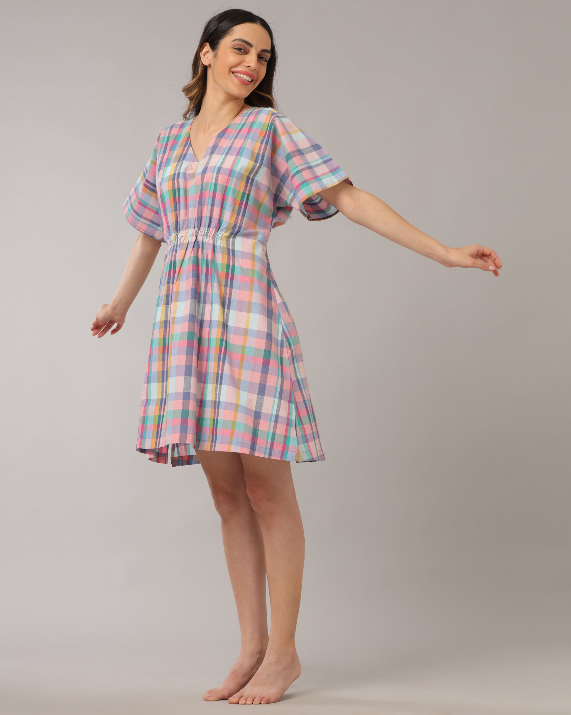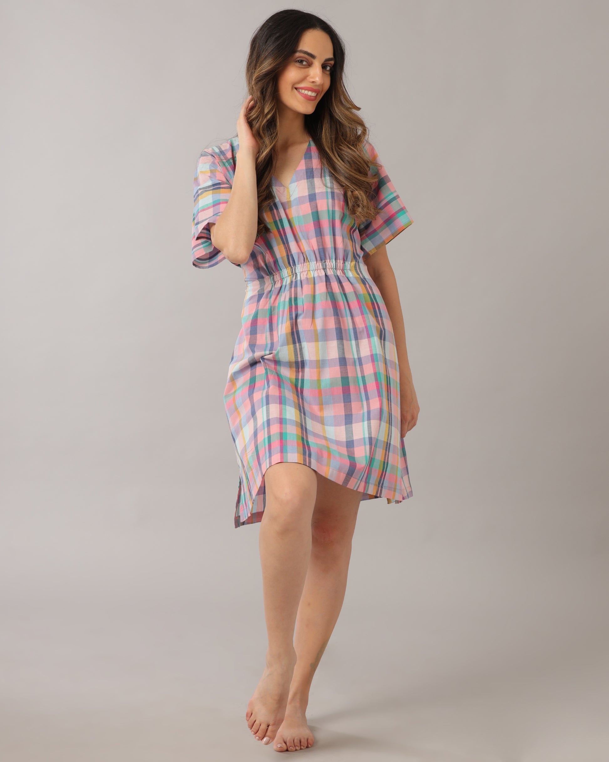 Essentials for your summer wardrobe. Made from breezy cotton and fun prints, these are tailor-made for your next beach day or a summer day around town! This particular design features a multicolor plaid woven fabric.